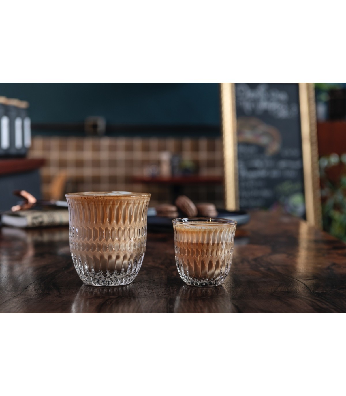 Su curvatura inferior ayuda a estabilizar la espuma y resalta la cremosidad en el centro, lo que lo convierte en el vaso perfecto para mostrar un latte art delicado y elegante. Esta pieza de cristal es una alternativa sofisticada a las tazas tradicionales de porcelana o cerámica, aportando estilo y modernidad al ritual del café.