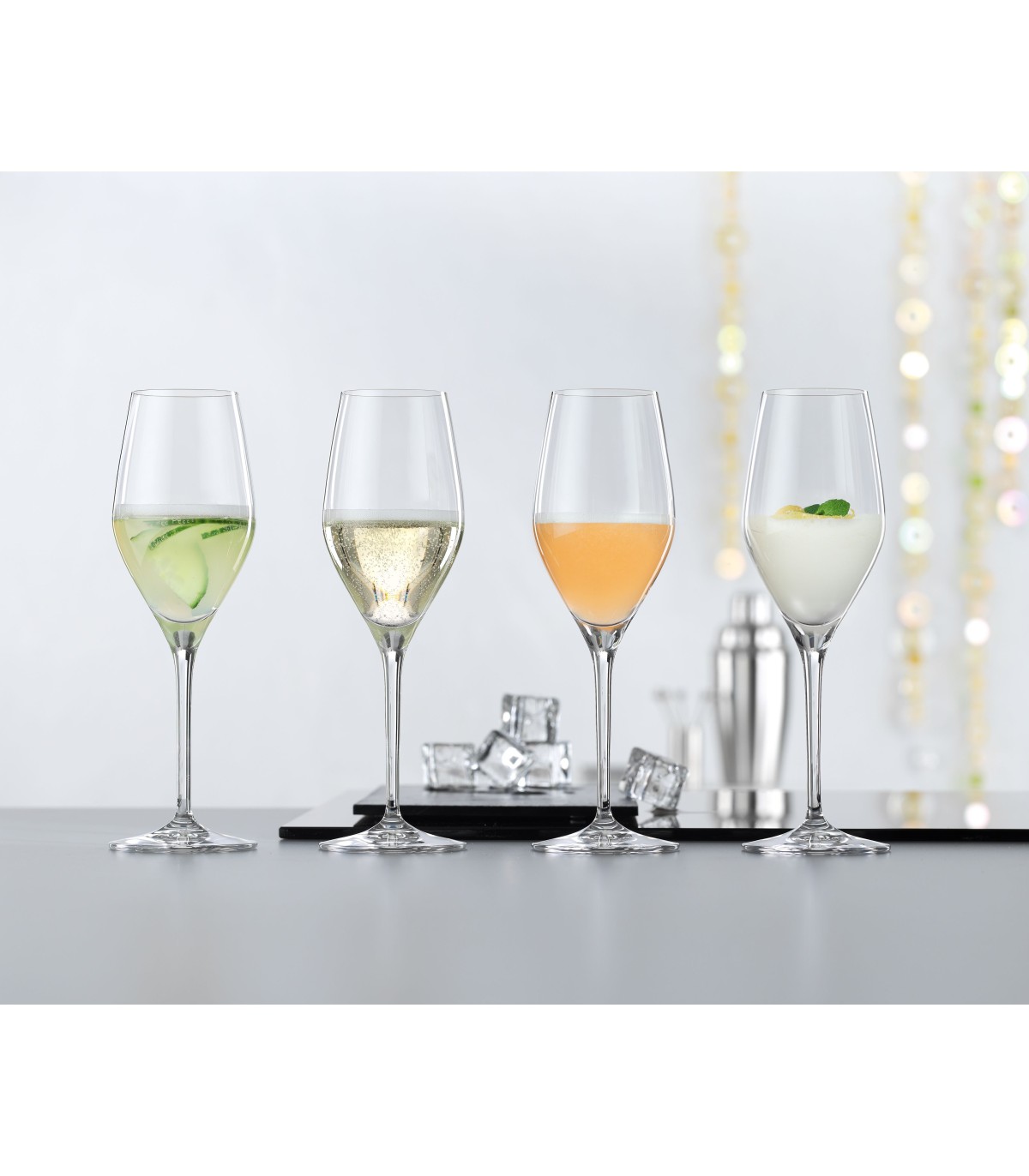 El set incluye 4 copas de champán, ideales para celebraciones y brindis especiales.