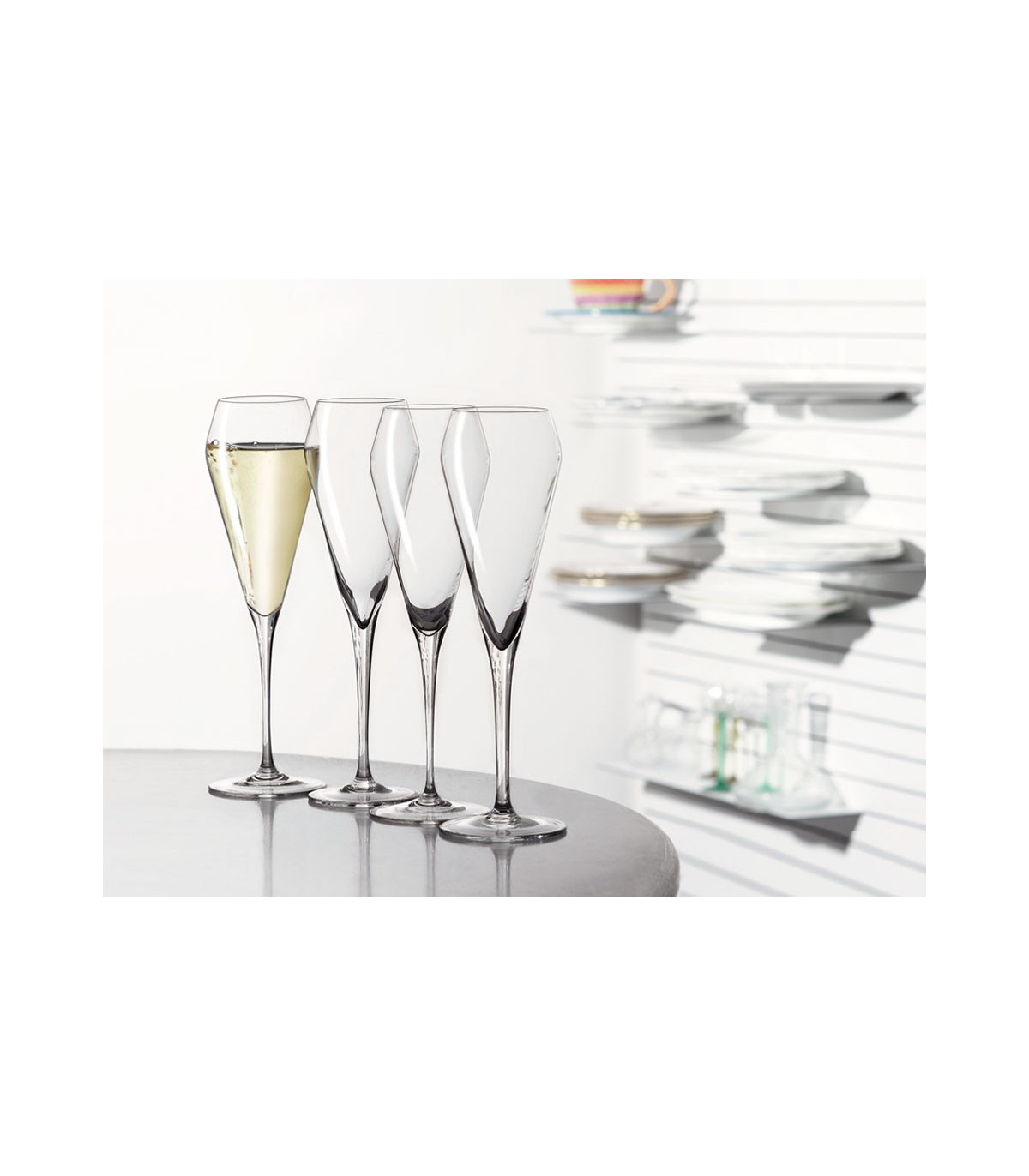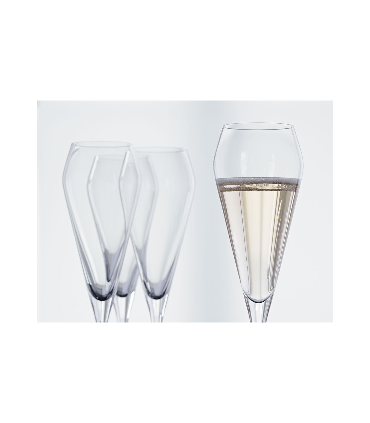La copa de champán es perfecta para desarrollar las complejas características del champán. Su forma de diamante permite que se despliegue una amplia gama de aromas porque sus ángulos marcados ofrecen mayor espacio para ello. El cáliz amplio permite que crezcan y se intensifiquen las complejas capas del aroma y el gran diámetro del borde las despliega como no lo consigue una copa estrecha como la flauta. Willsberger Anniversary de SPIEGELAU es la exitosa reproducción a máquina de la serie Willsberger, soplada a mano y famosa mundialmente.