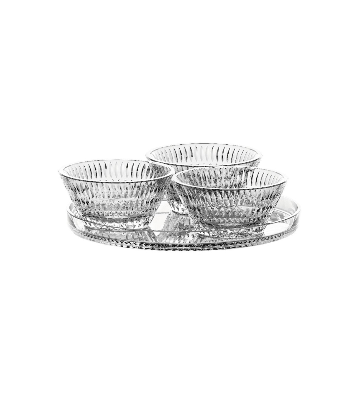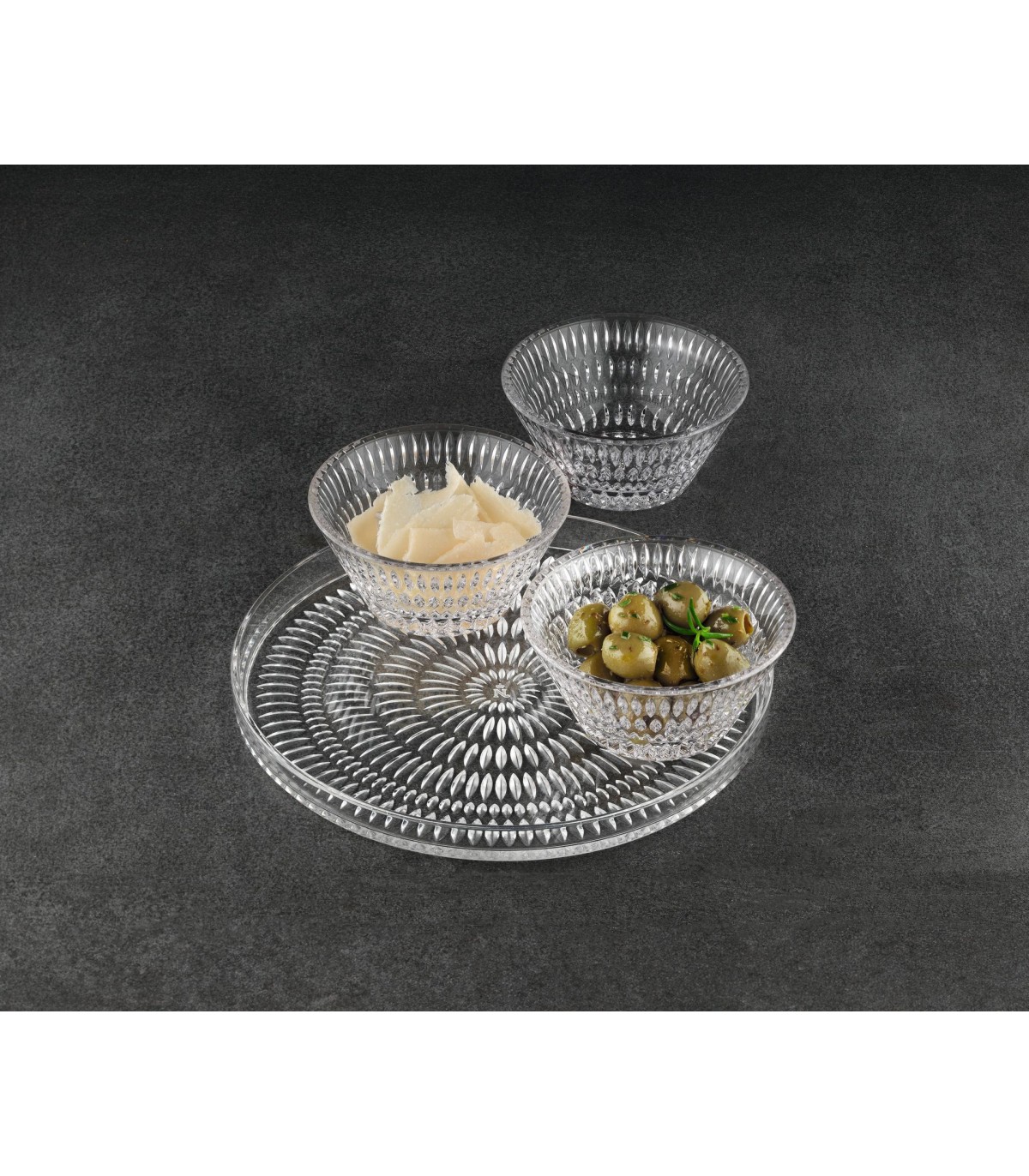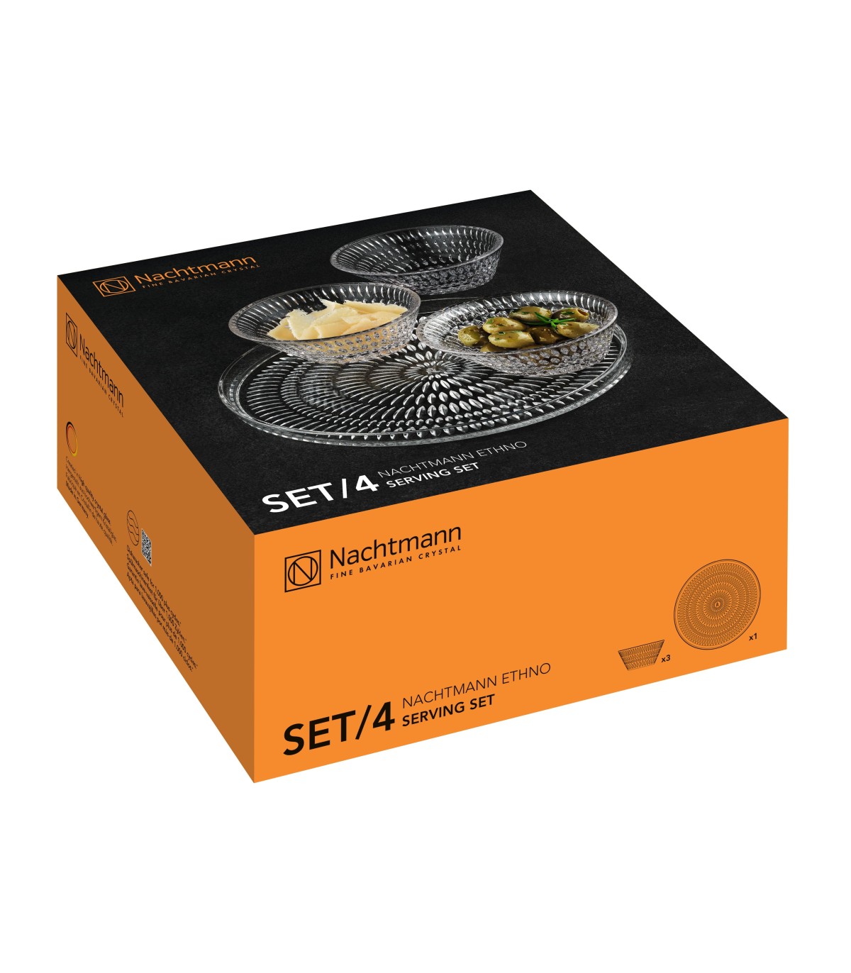 Este elegante juego de servicio de cristal NACHTMANN Ethno es la elección perfecta para quienes buscan sofisticación, funcionalidad y diseño contemporáneo en su mesa. El set incluye un plato de presentación con espacio para tres cuencos pequeños, ideal para servir antipastos, entrantes, aperitivos, snacks, salsas o acompañamientos de forma organizada y estética.