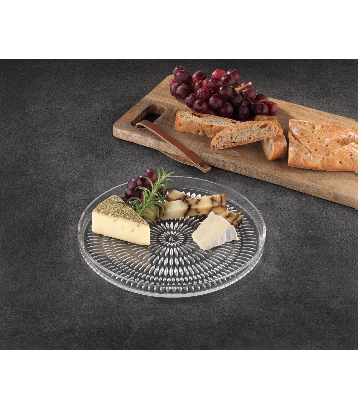 Elegante plato de la colección Ethno con su característico patrón de muescas fabricado con cristal de la más alta calidad. Perfecto para presentar aperitivos, pequeñas elaboraciones, postres.. Combina a la perfección con otras referencias Ethno.
