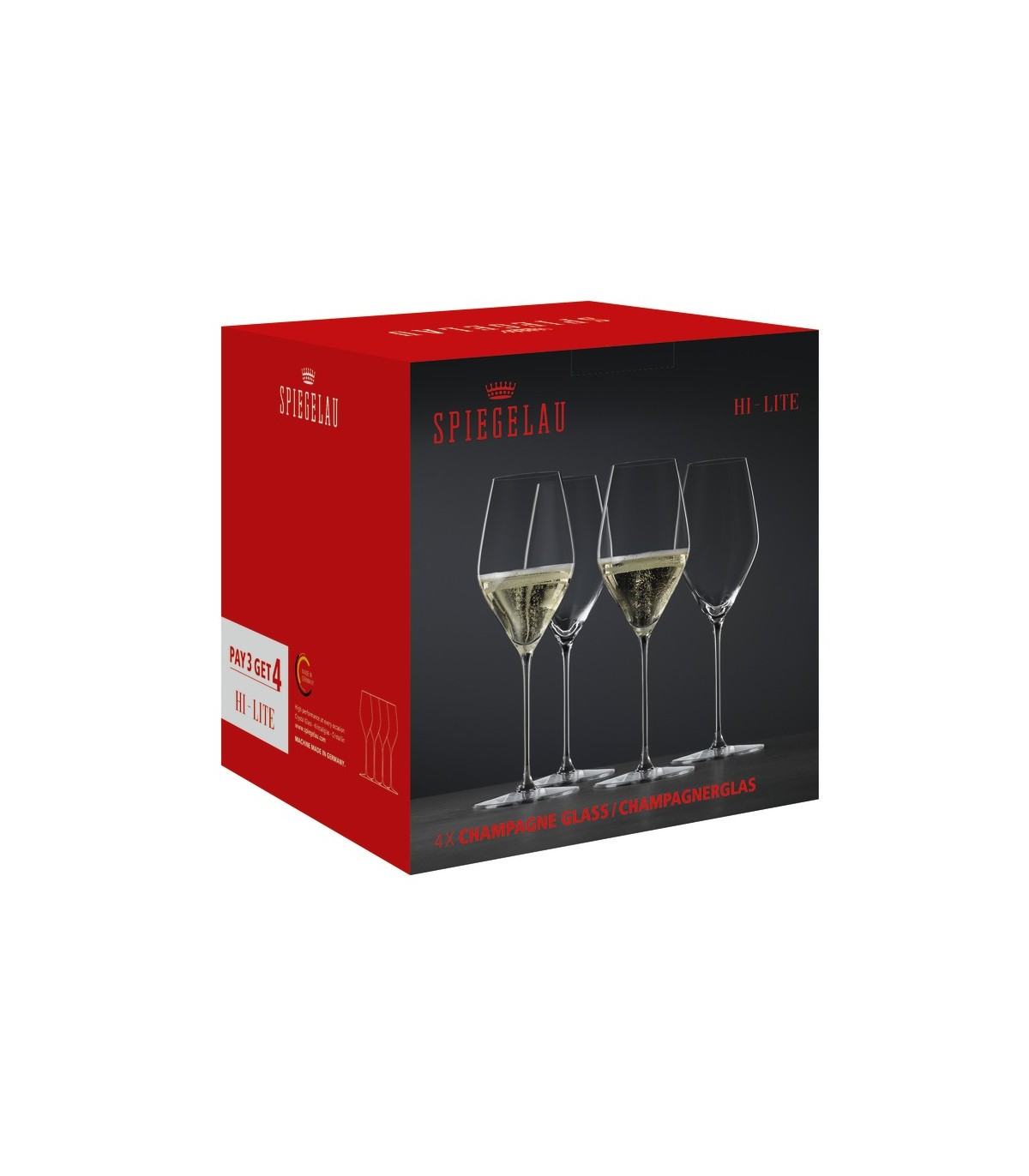 La Copa de Champagne Hi-Lite de SPIEGELAU está diseñada para realzar la complejidad de champagnes y espumosos. Su forma en diamante permite que los aromas se expandan y las burbujas se mantengan más finas y persistentes. La colección Hi-Lite ofrece ligereza, brillo y proporciones elegantes, combinando tecnología moderna con el estilo de la cristalería artesanal. El set incluye 4 copas de Champagne Hi-Lite, con 1 copa de regalo, perfectas para brindar con elegancia en cada celebración.
