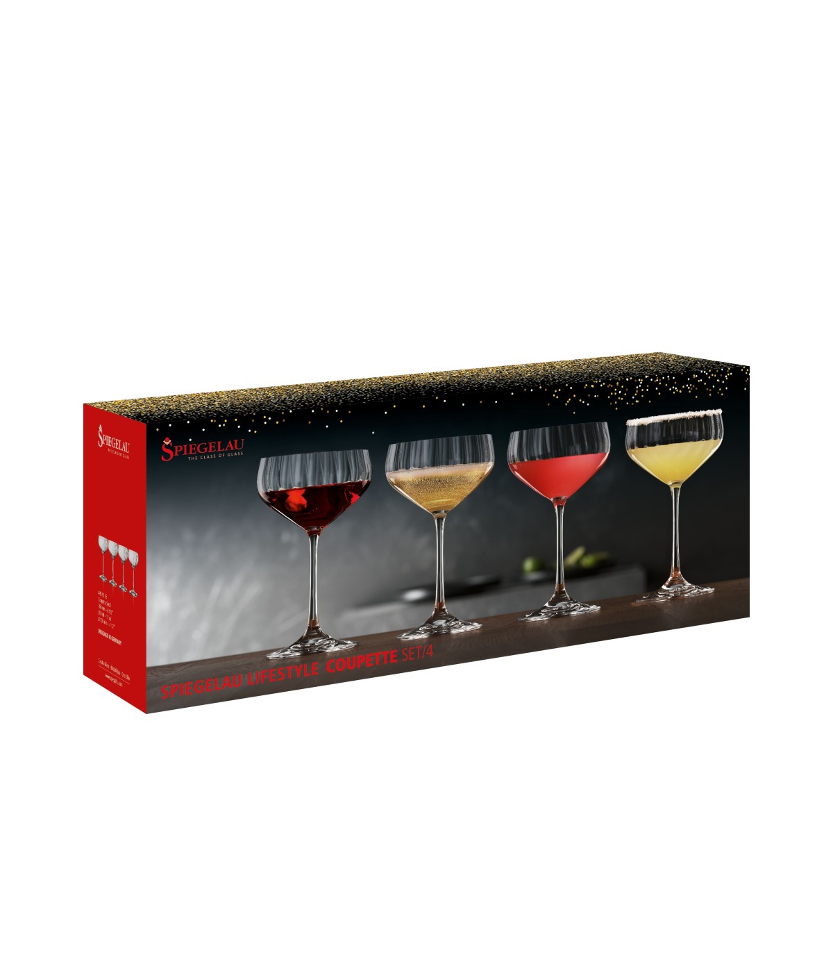 La copa Coupette Lifestyle de SPIEGELAU está diseñada para cócteles que combinan alcohol con zumo o mezclas, ofreciendo una capacidad mayor que la clásica copa de cóctel. Su forma resulta ideal para bebidas frías preparadas en licuadora con hielo, servidas con una textura similar a un sorbete. Inspirada en la palabra francesa coupe, que significa cuenco o copa, la Coupette se ha convertido en un imprescindible para quienes disfrutan de cócteles versátiles y sofisticados. La colección Lifestyle, con su decoración lineal y diseño en diamante, aporta brillo y efectos ópticos únicos que realzan cualquier mesa. Fabricadas a máquina en cristalin de alta calidad, estas copas pueden presentar pequeñas variaciones propias del proceso de producción. Aptas para lavavajillas, combinan elegancia y practicidad. El set incluye 4 copas Coupette Lifestyle, perfectas para cócteles creativos y presentaciones modernas.