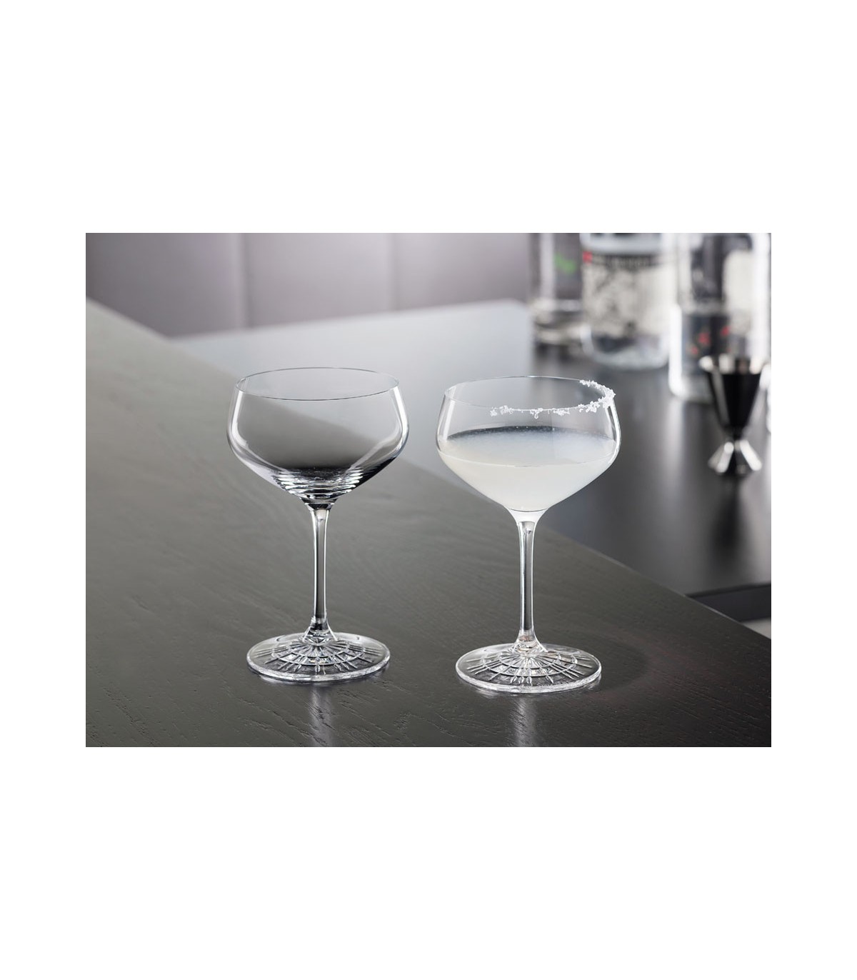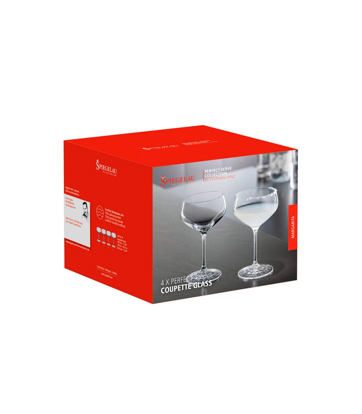La copa Coupette Perfect Serve de SPIEGELAU está diseñada para cócteles que combinan alcohol con zumo o mezclas, ofreciendo más capacidad que una copa de cóctel clásica. Su forma amplia la hace ideal para bebidas frías preparadas en licuadora con hielo, servidas con una textura similar a un sorbete. El nombre “Coupette” proviene del francés coupe, que significa cuenco o copa, y refleja su versatilidad en la coctelería. La colección Perfect Serve, creada en colaboración con el maestro coctelero de prestigio internacional Stephan Hinz, asegura el tamaño y la forma perfectos para cada cóctel, ya sea tradicional o innovador. Fabricadas a máquina en cristalin de alta calidad, estas copas pueden presentar ligeras variaciones derivadas del proceso de producción. Aptas para lavavajillas, combinan practicidad y elegancia. El set incluye 4 copas Coupette Perfect Serve, perfectas para elevar la experiencia de los cócteles en casa.